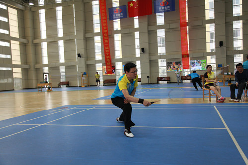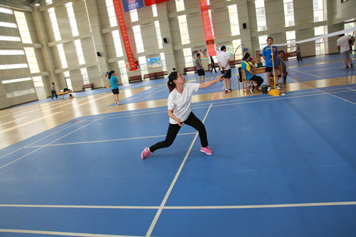 “友谊第一、比赛第二、热情参与、团结进步”。现场醒目的红色条幅,道出了全体参赛运动员的心声:大家既是对手,更是朋友、同事;场上剑拔弩张,场下握手言和。比赛开始后,场内竞争激烈,各队队员奋力拼搏,每球必争。赛场上,参赛选手们充满激情,尽情挥舞着手中的球拍,轻盈的羽毛球在场上不断翻飞跳跃。男选手们挥汗如雨,奋力拼杀;女选手们巧妙灵活,沉稳应战。选手们一次次高高跃起的精彩扣杀,一个个细腻灵巧的网前挑球……积极施展自己的技艺,对决异常紧张激烈,各种战术的灵活运用,扣人心弦的比赛让现场观众都为之聚气凝神。