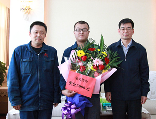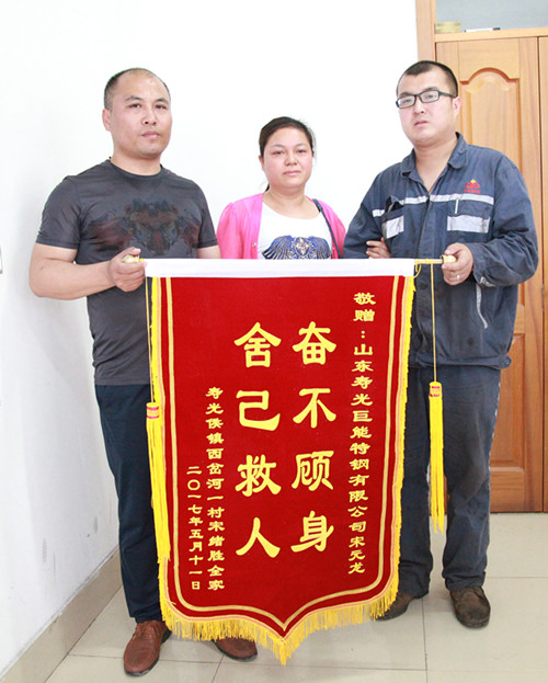最近几天,炼铁厂检修车间职工宋元龙成了寿光市民心目中的大英雄。一名16岁的女孩不慎跌入引黄济青。宋元龙路过此地看到后,立即下水施救并在岸边群众配合下一起将孩子救上岸。看到孩子并无大碍,他没留姓名就悄然离开。直到5月11日下午,获救孩子家人多方打听找到到我公司送上感谢信和锦旗表示感谢,大家才知晓他的救人事迹。为了表彰他这种见义勇为的精神, 5月15日,公司董事长张明荣对勇救落水女孩的宋元龙颁发奖金5000元,对他的见义勇为行为给予表彰奖励。