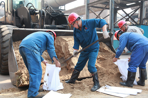 特钢公司总调度室启动防汛黄色应急预案,各单位按照演练预案立即组织开展防汛工作。各单位得到通知后,分别组织义务防汛队队员对各重点防汛部位和落水口进行检查,对淤堵落水口进行清理,发现部分地点进水,防汛队员利用防汛沙袋进行封堵,应急分队铲装沙袋60余袋,共封堵重要设备地区5处。同时负责公司外排防汛口的烧结厂、轧钢厂、钢管厂、动力厂分别确认所辖区域内的防汛口闸板阀处排水情况,并在外部水位低于公司水位时开启闸板阀排水,以缓解内部防汛压力,经过各单位的努力,特钢公司内部水位得到控制,未造成大的影响。