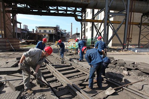 在炼铁厂铁路道口施工现场,十几名检修工正头顶烈日对铁路进行抬高捣固。他们脸和脖子都被晒得通红,汗水早已湿透了工作服,衣服上也已经结出了盐花。即便如此,他们也不曾有一丝懈怠,只为在规定的时间内完成任务。尽管早有思想准备,但那50多度的铁轨温度着实让大家接受着严峻“烤”验。整个检修任务干下来,大家都累得直不起腰。“每当看到自己的付出换来机车的平安运行,再苦再累都是值得的。”现场检修工如是说。