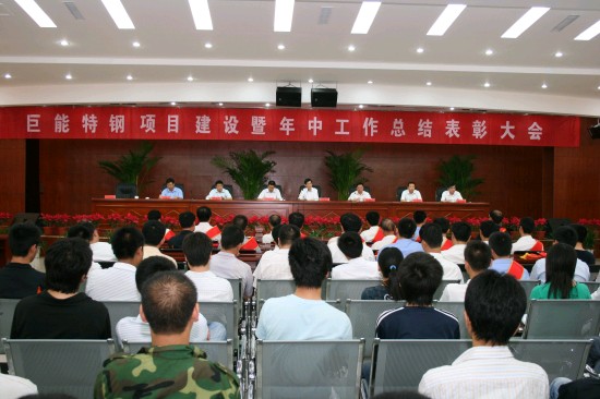 7月18日上午,巨能特钢项目建设暨半年工作总结表彰大会在该公司综合楼大楼大会议室召开。公司董事长张明荣、党总支书记韩佩璋、总经理刘发友,副总经理于克臣、张洪波、朱卫东,总会计师冯鲁峰出席会议。